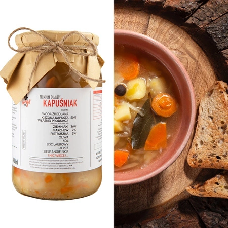 Skład: woda, kapusta kiszona własnej produkcji (kapusta, marchew, sól), ziemniaki, marchew, pietruszka, oliwa, sól, liść laurowy, pieprz, ziele angielskie