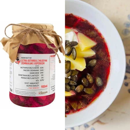 Woda, botwina, ziemniaki, marchew, śmietana bez laktozy 18%, masło bez laktozy, sól, ocet jabłkowy 5%, koper świeży.