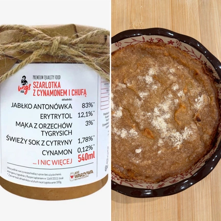 Wyjątkowy smak Babcinej - prawdziwej - szarlotki zamknięty w słoiku. Ekologiczne jabłka antonówki - najładniejsze i najbrzydsze prawdziwe pieczone jabłka, połączone z cynamonem, sokiem ze świeżej cytryny i orzechami tygrysimi to nowsza wersja klasycznego ciasta dla wszystkich, którzy nie mogą jeść glutenu, ani zbóż.